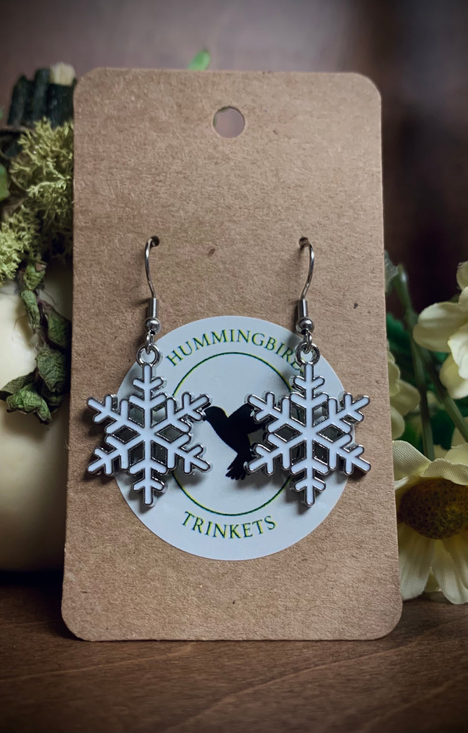 Hypoallergenic surgical steel hooks and Snowflake enamel pendants.